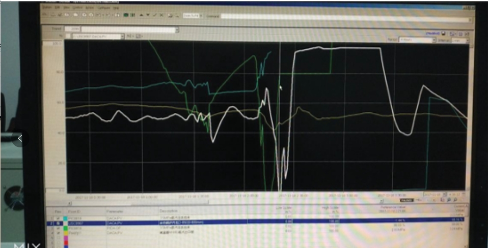 11月18日凌晨1:05车间中压蒸汽管网压力PIC01显示中压蒸汽压力逐渐上升,控制阀PV01逐渐关闭;2:05 蒸汽压力显示开始急速上升,最高显示值达到4.7MPa,蒸汽锅炉压力从3.34 MPa急速降至2.51MPa;