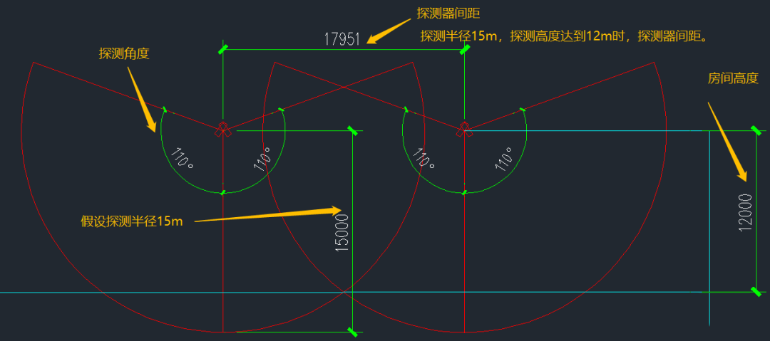我们看一下探测角度110度,探测半径15m的情况:房间高度12m,探测器2个1组,间距17.9m。