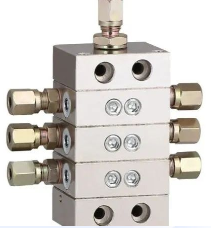 递进式分配阀是将泵送来的润滑油脂通过数个出口分配成几个等量、不等量的管路,分配往每一个管路的剂量就是和这个管路对应的润滑点所需要的润滑量。