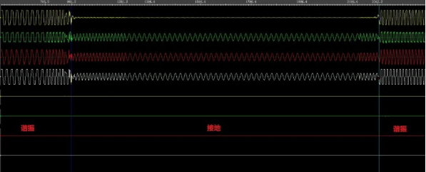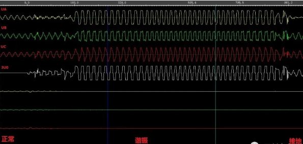 开始阶段,显示了谐振持续一段时间后消失,但系统电压并没有恢复正常,而是变成A相接地。而在波形的后半部分,接地消失了,而波形再次呈现出谐振的特征。