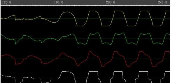 波形被压缩到这个程度,波形的细节就全没了。但可以在波形中看到电压升高、电压正常、故障电流出现、接地出现等整体的过程。