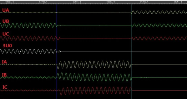 下图是整个故障过程的录波图。因为故障过程很长,波形被横向压缩了。
