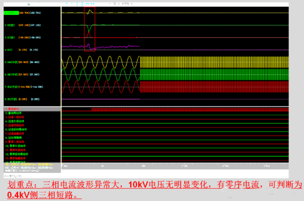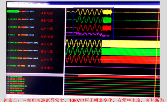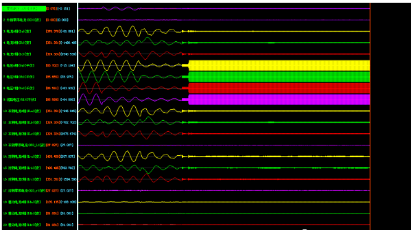 左侧上部为模拟量采样数据,蓝色数据为正常时有效值,红色数据为鼠标所在波形的有效值,右上侧是波形。
