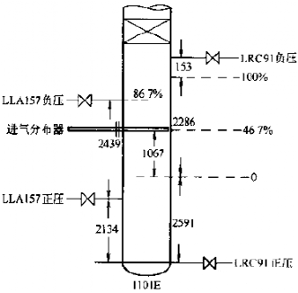 (2) 从KW1101E设备结构及仪表取压位置(图3-5)中可以看出,KWZKLLA157负压取压位置在KWZKLRC91的86.7%处。因此,当设备内(带气泡)液面高度超过KWZKLRC91的86.7%处(KWZKLLA157负压位置)时,由于KWZKLLA157负乐位置以上的液体产生的压力也作用于它的负压侧,因此,KWZKLLA157差压变送器无法测量其负压侧以上的液体。同样道理,KWZKLRC91也无法测量其负压侧以上的液体高度。因此,位于KWZKLRC91负压侧与KWZKLLA157负压侧之间的液柱就成为了KWZKLRC91与KWZKLLA157测量指示值的偏差。鉴于此,KWZKLRC91的测量值是达不到最大的。经计算,最高时KWZKLLA157应比KWZKLRC91低近20%(457/2286=19.99%)。