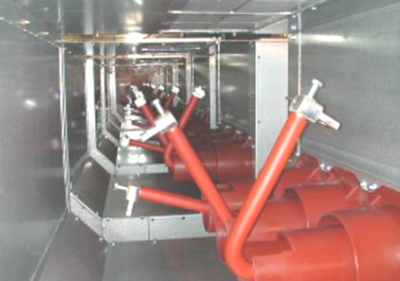 触头盒需要满足产品相应电压等级绝缘要求,如40.5kV触头盒工频耐受电压1分钟95kV,雷电冲击耐受电压185kV,因此触头盒需要满足净距、爬距要求,以及触头盒的壁厚需要承受冲击耐压的要求,当触臂进入触头盒内部后,触臂与安装钢板之间虽然有环氧树脂绝缘,但如果空气间隙过小,如环氧厚度10mm,而空气间隙只有20mm,则根据电容分压理论,空气间隙电场强度超过正常值,容易造成击穿;同时要保证爬距的有效性,如材料的耐电痕指数高,则可以减少爬距。触头盒需要承受短时耐受电流要求,如4秒短时耐受电流31.5kA,峰值耐受电流80kA。因此触头盒应具有一定的机械强度,如抗弯大于8kN。