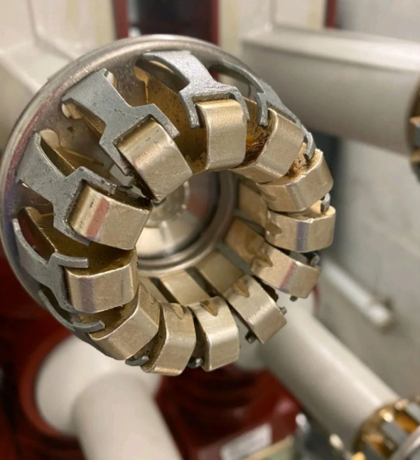 3. 隔离开关具有一定的自然灭弧能力,常用在电压互感器和避雷器等电流很小的设备投入和断开上,这时电流很小,隔离开关触头可以很小; 如充气柜中的电压互感器隔离采用铜丝与铜排接触,实现接通或断开。而电压互感器手车、避雷器手车触头也是很小的电流,这是就不需要梅花触头,采用撞针就可以,撞针与铜排直接接触,通过弹簧具有一定的压缩量保证接触就可以了。