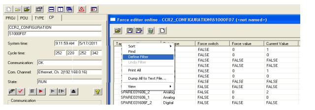 1.点击右键后左键单击control panel(控制面板),在左侧项目栏cp项目卡下点击Force editor进入强制列表。搜索位号方法,点击TAG NAME 右键选中Define Filter  输入*  位号 *  回车  ,用鼠标点击TAG NAME 与 DATE TYPE 中间线 右拉 以方便位号完整显示。