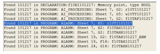 查找结果如下截屏所示。根据描述这个位号在程序“Alarm”的第7页,这样就可以到在线模式中相应的点。