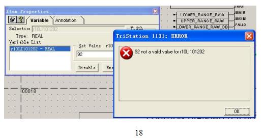11.4整形(REAL)和实型(DINT)信号的强制和恢复强制方法和恢复方法与开关量信号的强制和恢复方法是一样的。唯一需要强调的是,在对整形(REAL)信号输入强制值的时候必须输入带小数点的值,例如需要输入强制值为“92”,实际输入的时候必须输入“92.0”如果输入数据格式错误会出现如下提示。这个时候不要紧张,只要点击OK后重新输入正确数据格式的强制值即可。