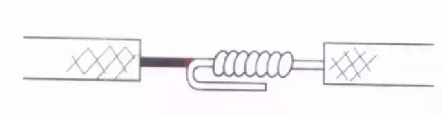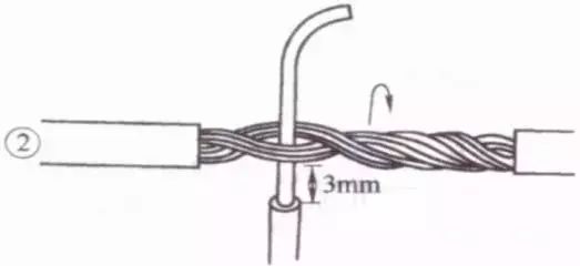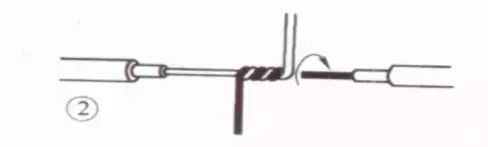 ⑤接着把这两股芯线按顺时针方向紧缠2圈后,再折回90° 并平卧在折起前的轴线位置上。