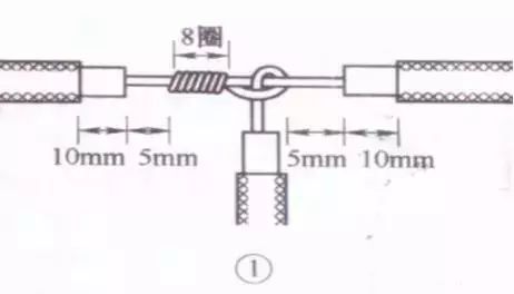 ①将支路芯线的线头与干线芯线十字相交,在支路芯线根部留出5mm,然后顺时针方向缠绕6~8圈后,用钢丝钳切去余下的芯线,并钳平芯线末端。