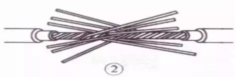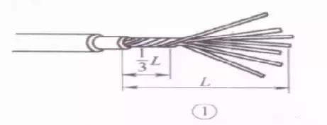 ①先将剥去绝缘层的芯线头散开并拉直,再把靠近绝缘层1/3线段的芯线绞紧,然后把余下的2/3芯线头按图示分散成伞状,并将每根芯线拉直。