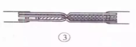 将两根双芯线线头剖削成图示中的形式。连接时,将两根待连接的线头中颜色一致的芯线按小截面直线连接方式连接。用相同的方法将另一颜色的芯线连接在一起。