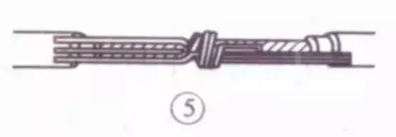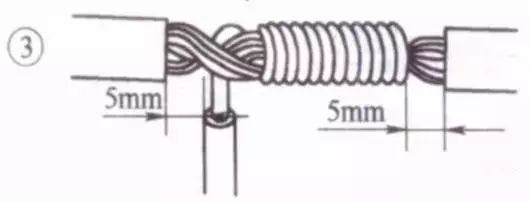 把细导线线头在粗导线线头上紧密缠绕5~6圈,弯折粗线头端部,使它压在缠绕层上,再把细线头缠绕3~4圈,剪去余端,钳平切口。