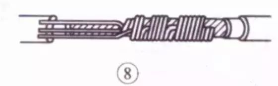 ⑦把余下的3根芯线按步骤⑤ 方法缠绕至第2圈时,把前4根芯线在根部分别切断,并钳平;接着把3根芯线缠足3圈,然后剪去余端,钳平切口不留毛刺