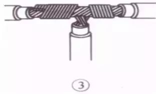 ②把3根线芯的一组在干线右边按顺时针方向紧紧缠绕3~4圈,并钳平线端;把4根芯线的一组在干线的左边按逆时针方向缠绕4~5圈。